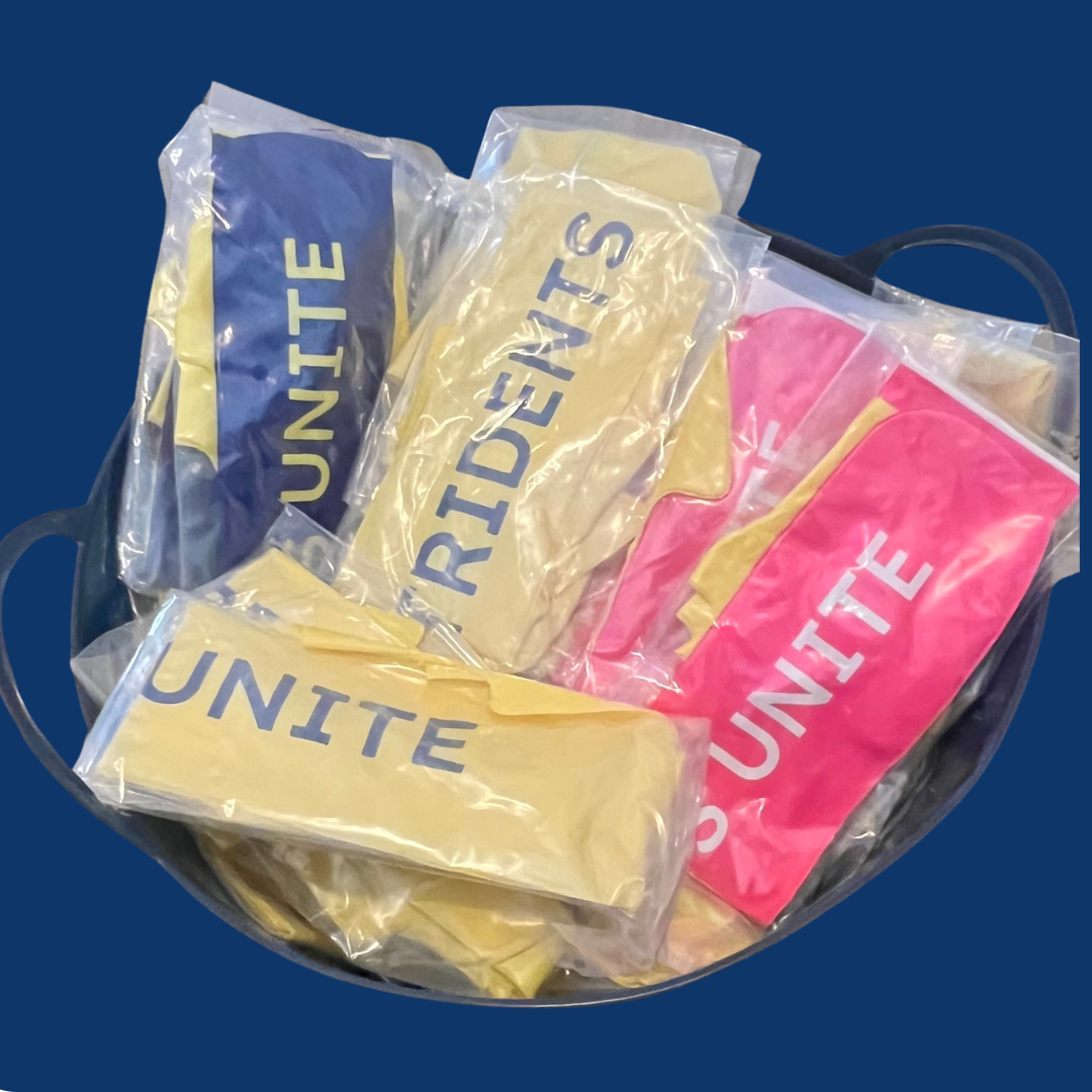 - Bright yellow trident with a dark blue handle, signature two-stripe detail, and bright yellow "Tridents Unite" lettering